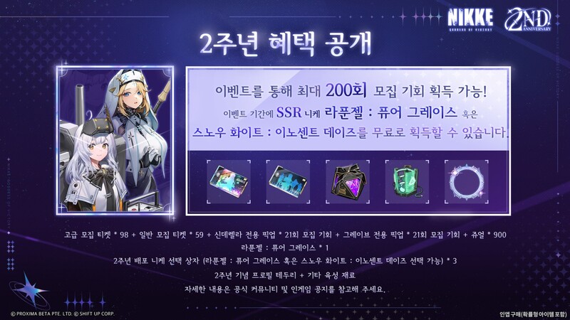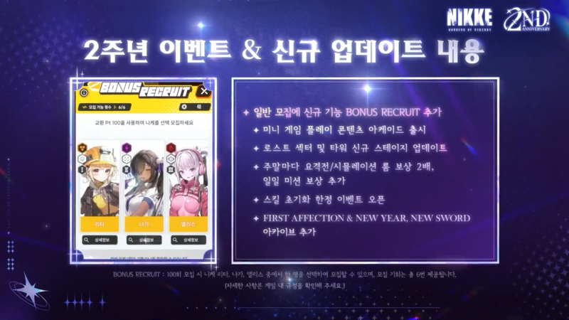 '니케'는 2주년을 맞이해 최대 173회 무료 모집 기회를 제공하며, 방송 종료 후 커뮤니티 안내를 통해 추가 무료 모집 이벤트를 알리면서 총 200회 모집 계획을 알렸다. 이번 2주년 방송은 한국, 일본, 영어권 등 각종 지역에서 10만 명 이상 동시 시청자가 지켜보며 글로벌 인기 게임의 관심도를 입증했다.
