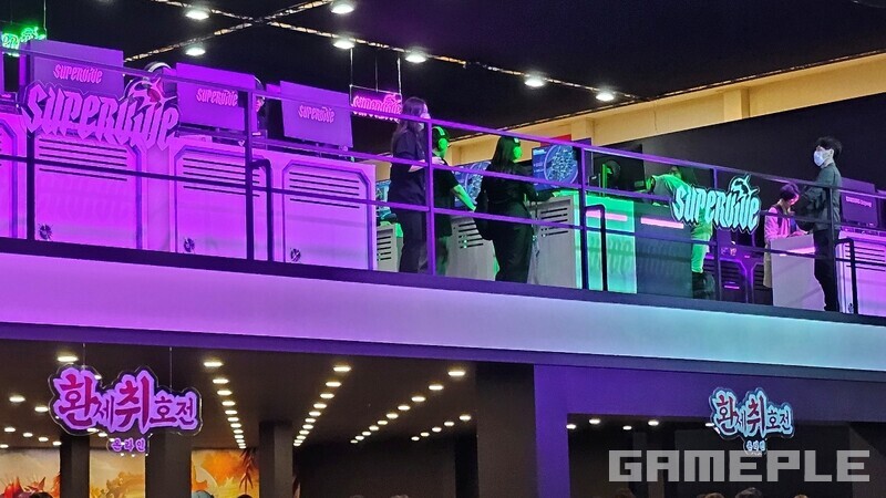 물론 관람객의 우선 방문 코스는 시연이었다. MOBA 배틀로얄 '슈퍼바이브', 3D 액션 RPG '프로젝트 오버킬', 하드코어 액션 RPG '퍼스트 버서커: 카잔', 캐주얼 RPG '환세취호전 온라인' 4종을 부스 양 옆에서 체험할 수 있었다.