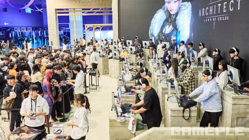 또 다른 BTC 영역인 벡스코 제2전시장 1층에서는, 언리얼 엔진5를 활용한 수준 높은 그래픽과 기술력이 집약된 AAA급 신작 '아키텍트: 랜드 오브 엑자일'을 출품한 하이브IM이 정중앙에서 시선을 독차지했다.