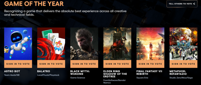 GOTY 후보작으로는 SIE의 ‘아스트로봇’, 로컬성크의 ‘발라트로’, 게임 사이언스의 ‘검은 신화: 오공’, 프롬 소프트웨어의 ‘엘든 링: 황금 나무의 그림자’, 스퀘어 에닉스의 ‘파이널 판타지 VII 리버스’, 아틀러스의 ‘메타포: 리판타지오’가 이름을 올렸다.