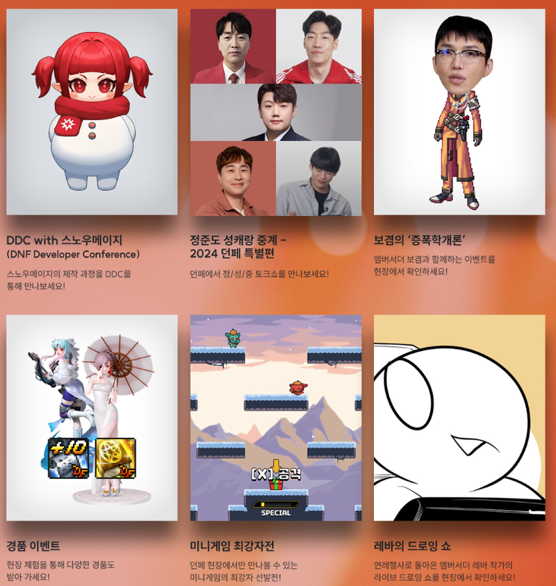 대표적인 프로그램이 'DDC'다. 'DNF Developers Conference'의 약자로, '던페' 같은 자리마다 마련되는 던파 개발자들의 특별 강연이다. 유익하기도 하며, 어려운 내용도 누구나 이해하게끔 쉽고 재미있게 풀어내 인기가 높다. 이번 DDC에서는 스노우메이지 제작 과정을 유저들에게 풀어낼 예정이다.