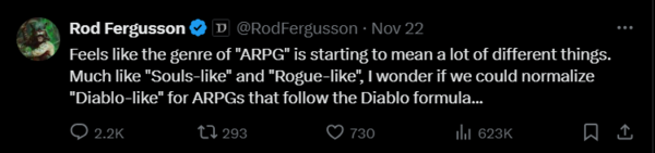 로드 퍼거슨은 22일 X를 통해 “액션 RPG 장르가 다양한 의미를 갖기 시작한 것 같다”며 "소울라이크와 로그라이크처럼 액션 RPG 장르를 ‘디아블로라이크’라고 일반화할 수 있을지 궁금하다”고 전했다.