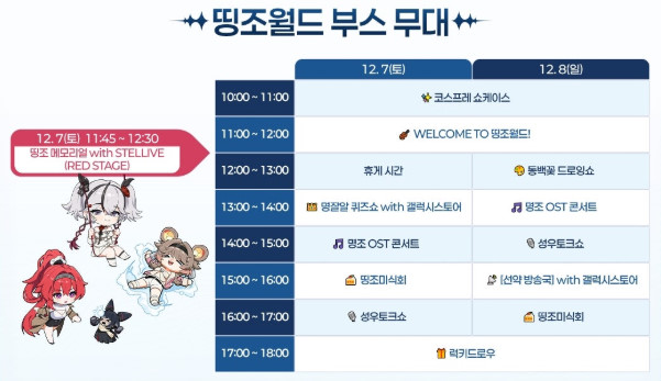 현장에서는 한국어 공식 테마송을 담당한 '돈쥬', '요아리', '지인' 등 모든 가수와 연주자 'DOO'까지 총출동해 명조 OST 콘서트 라이브를 진행한다. 빵떡 그림의 달인 '아르(Are)' 작가의 '동백꽃 드로잉쇼'도 챙겨볼 무대 중 하나다.