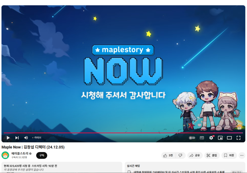 메이플스토리 'NEXT' 쇼케이스 사전 방송의 시청자가 33만 명까지 치솟았다.