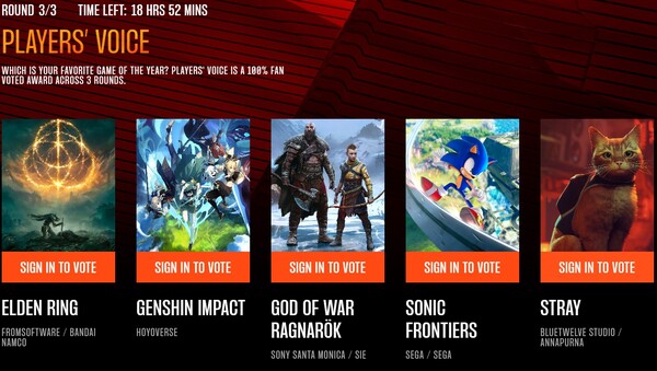 한국 시간으로 13일 오전 9시 30분 개최되는 대표적인 게임 시상식 ‘더 게임 어워드(TGA)’에는 유저들의 인기 투표로 수상이 결정되는 ‘플레이어스 보이스(유저들의 목소리 상)’ 부문이 있다. 일종의 인기상이다.