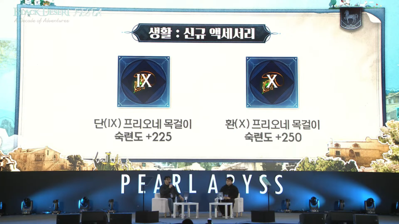 신규 ‘프리오네’ 액세서리는 검은사막 생활 콘텐츠에 도움을 주는 액세서리로 ‘카라자드’ 액세서리와 동일하게 ‘환(X)’ 등급까지 강화할 수 있다. 강화 재료로 ‘검은 결정’류 아이템을 사용한다. 목걸이를 기준으로 최대 250까지 생활 숙련도를 얻을 수 있다.