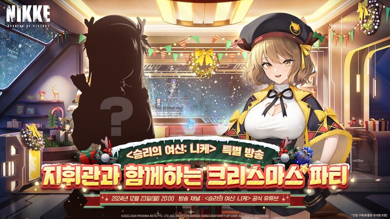 시프트업이 개발하고 레벨 인피니트가 서비스하는 '승리의 여신: 니케'가 크리스마스 특집 방송을 예고했다. 23일 오후 8시 유튜브 공식 채널을 통해 진행되며, 방송 진행 캐릭터는 '아니스'와 추후 공개될 하나를 포함해 두 명이다.