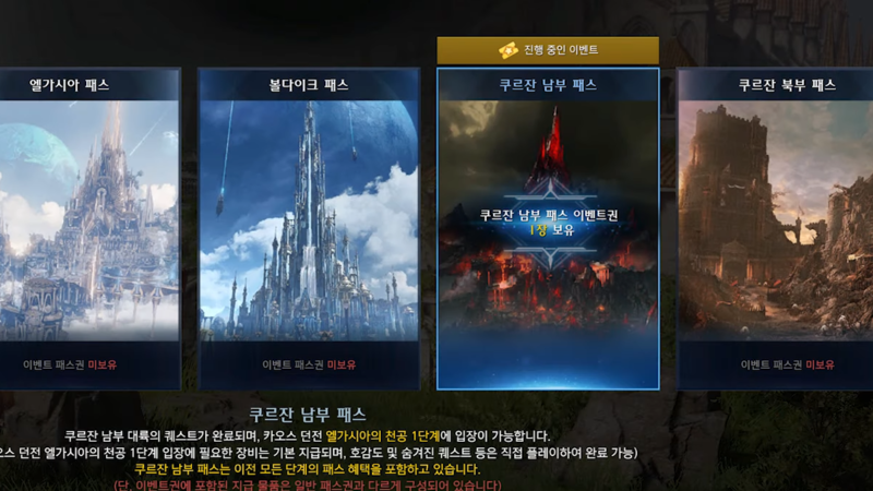 현재 게임을 시작하면 이벤트 점핑권을 받을 계정을 선택하고, 트리시온 패스 선택 화면에서 '쿠르잔 남부 패스' 이벤트권을 골라 접속이 가능하다. 새로 캐릭터를 만들어 접속하고 지급 장비를 착용하면 아이템 레벨 1585로 시작한다.