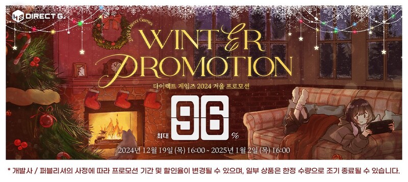 다이렉트 게임즈가 동시에 시작한 겨울 할인 프로모션도 주목할 필요가 있다. 코드를 구매하고 스팀에서 등록해 라이브러리에 추가하는 방식이며, 스팀보다 조금 더 저렴한 가격으로 제공하는 경우가 많아 국내 유저에게 매우 유용하다.