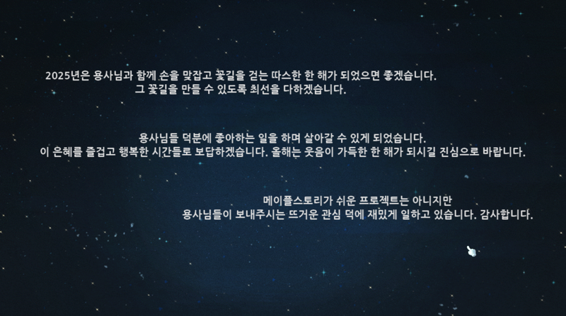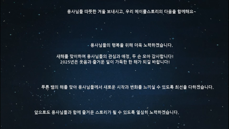 지난 2024년. 용사님들과 함께 메이플월드에서 써 내려간 이야기는 죄송합니다. 더 잘 하겠습니다. 같은 말들로 시작해서 감사합니다. 덕분입니다. 같은 말들로 맺어졌습니다.