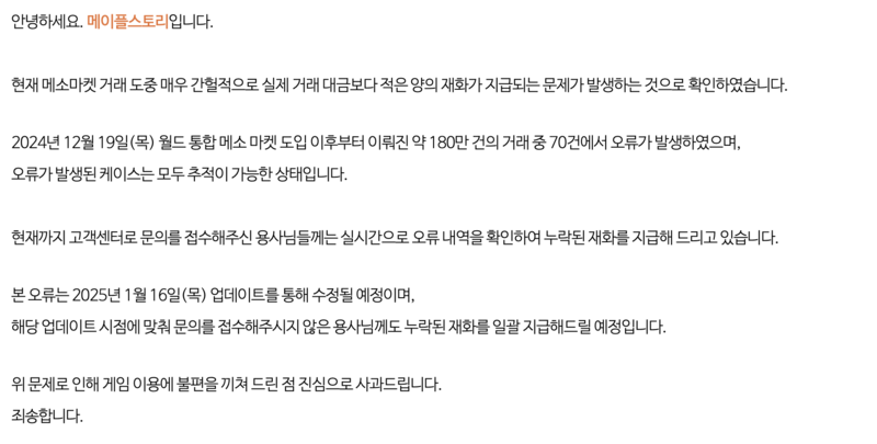 메이플스토리 측도 발 빠르게 대응했다. 게시글이 올라온 지 몇 시간 뒤인 오후 8시 경, ‘간헐적으로 발생되는 메소마켓 거래 오류 안내’ 공지가 올라왔다. 공지에 따르면 12월 19일 월드 통합 메소마켓 도입 이후부터 이뤄진 약 180만 건의 거래 중 70건에서 오류가 발생했으며, 오류가 발생된 케이스는 모두 추적이 가능한 상태라고 전했다. 일종의 전수조사가 이루어진 셈이다.