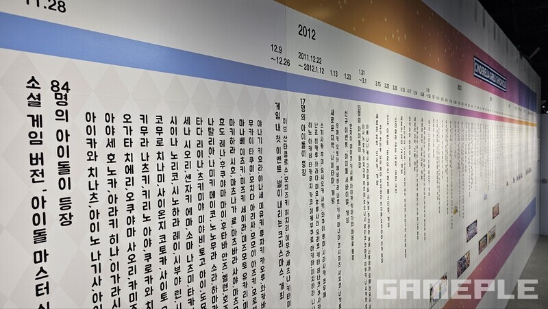 소셜 게임으로서 걸어온 길을 요약한 연대표는 벽 한 면을 가득 채웠다. 2011년 11월 28일 아이돌 84명과 함께 게임을 출시할 때부터 2025년 이번 전시회가 열리기까지 14년간 기록이다. 그중 2023년 이후 공백은 갑자기 마음을 아프게 만든다.