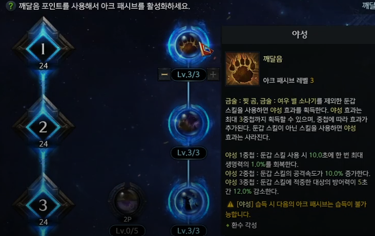 스킬 목록을 보면 일반 곰 스킬이 2개뿐이다. 2개의 곰 스킬로 야성 3중첩을 어떻게 만들며, 곰 게이지는 어느 세월에 채울까? 해답은 아크패시브 도약 노드 ‘민첩한 몸놀림’이다.