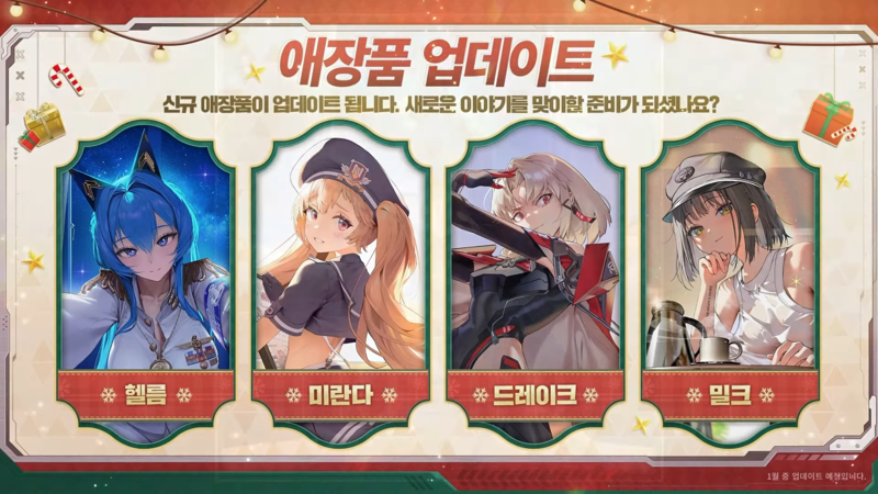 이번에 애장품을 받은 니케는 헬름, 미란다, 드레이크, 밀크 4종이다. 전체 애장품은 총 9종으로 늘었다. 6개월 간격으로 여러 명 니케를 선정해 추가하는 방식이므로 당분간 현재 애장품에 집중할 수 있다.