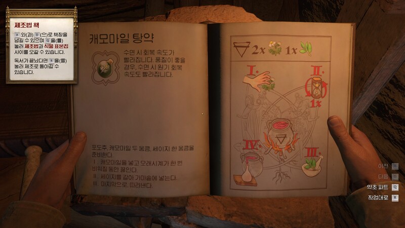천수국 탕약은 진리요 생명이다. 전작에 이어 만들기 쉽고 강력하며 팔아도 되는 회복약이다. 쐐기풀과 천수국만 채집하면 되니 초반부터 집중해서 많이 만들고 잘 마시자. 둘 모두 트로스코비츠 묘지 등 여러 곳에 함께 자라고 있어서 재료 구하기도 쉽다. 레시피는 첫 마을에서 판매한다.