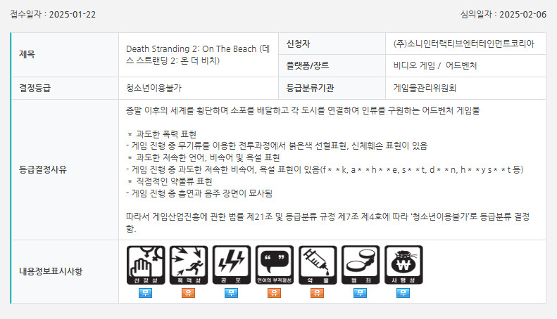 게임위는 2월 6일, 소니가 신청한 '데스 스트랜딩2: 온 더 비치'를 청소년 이용불가 등급으로 심의 결정했다. 심의가 접수된 시기는 1월 22일이다.