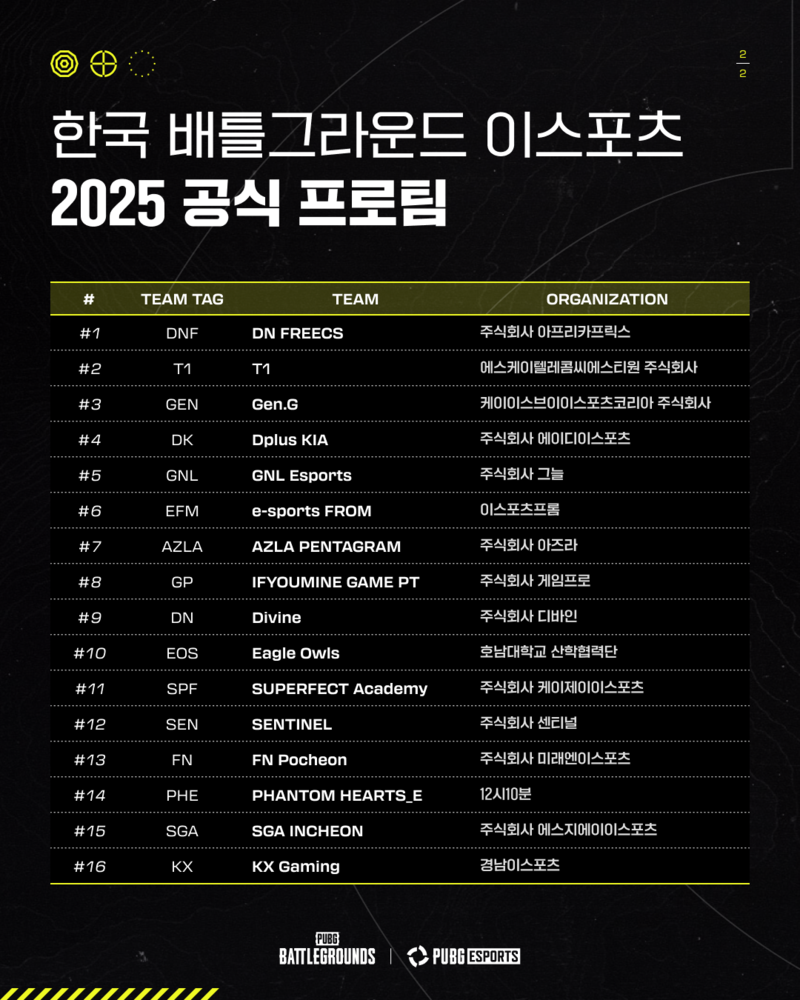 한편 크고 작은 변화가 생긴다. 우선 올해부터 프로팀 수가 16개로 확대됐다. 크래프톤은 “지난해 팬 여러분의 뜨거운 성원에 힘입어 많은 팀이 신청을 해주셨으며, 이들 중 엄선된 팀들이 올해 공식 프로팀으로 선정됐다”고 밝혔다.