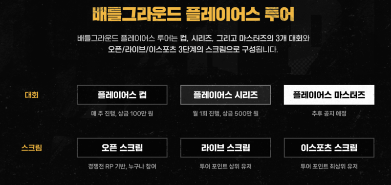 플레이어스 마스터즈 대회는 주요 프로팀도 참가하는 최상위 대회로 4월과 6월, 8월과 10월 총 4번 진행될 예정이다. PPT는 지난 11월부터 매주 진행되고 있으며 현재 플레이어스 컵 11, 플레이어스 시리즈 2까지 열렸다. 펍지 e스포츠 팬들이라면 익숙한 프로 선수들은 물론, 반가운 전 프로 선수들도 상당수 참가하고 있다.
