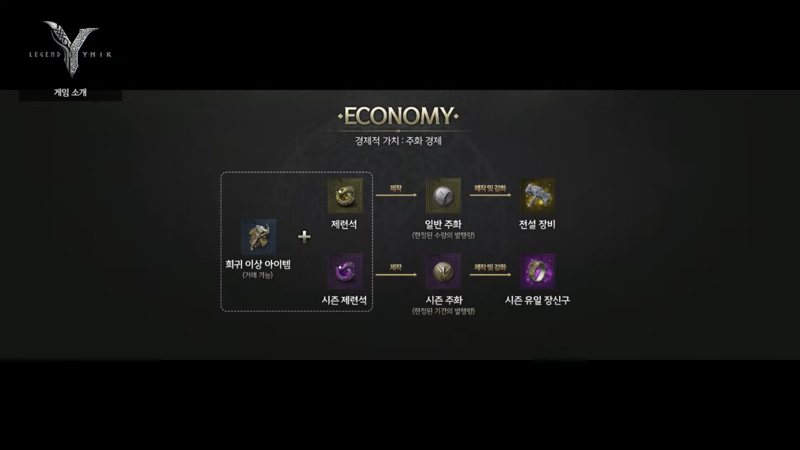 일반 주화는 전설 장비의 제작 및 강화에, 시즌 주화는 시즌 장신구의 제작 및 강화에 소모된다. 레전드 오브 이미르는 “최상위 장비라는 확실한 사용처와 한정된 수량의 재화를 통해 전에 볼 수 없었던 인게임 경제의 새로운 판을 만들고자 한다”고 전했다.