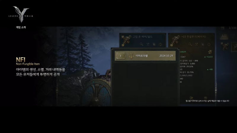 NFI는 최고 등급 아이템에 부여되는 식별 코드로, 이로 인해 해당 아이템의 생성, 소멸, 거래 내역 등의 모든 정보가 유저들에게 투명하게 공개된다. 레전드 오브 이미르는 투명성에 더해 유저들이 아이템의 역사를 직접 써 내려가며, 아이템에 정서적 가치를 부여할 수 있다는 것도 NFI의 큰 장점 중 하나라고 전했다.