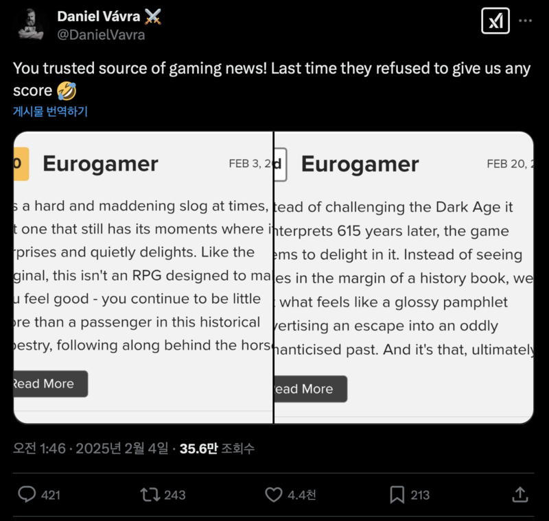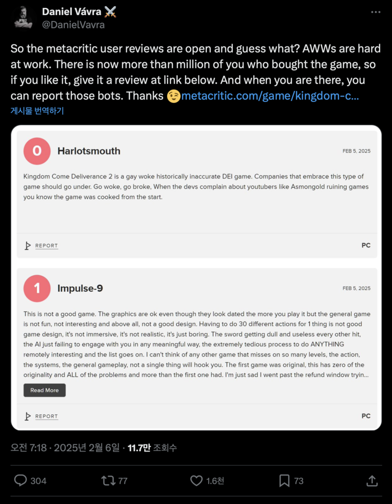 그러자 킹덤컴2의 개발사인 워호스 스튜디오의 공동 창립자이자 크리에이티브 디렉터인 다니엘 바브라가 이 매체의 리뷰를 본인 X에 직접 올려 저격했다. 해당 매체는 전작인 킹덤컴1 역시 혹평했던 바 있는데, 다니엘 바브라 역시 “전작에는 아예 점수조차 안 줬다”며 이를 지적했다.