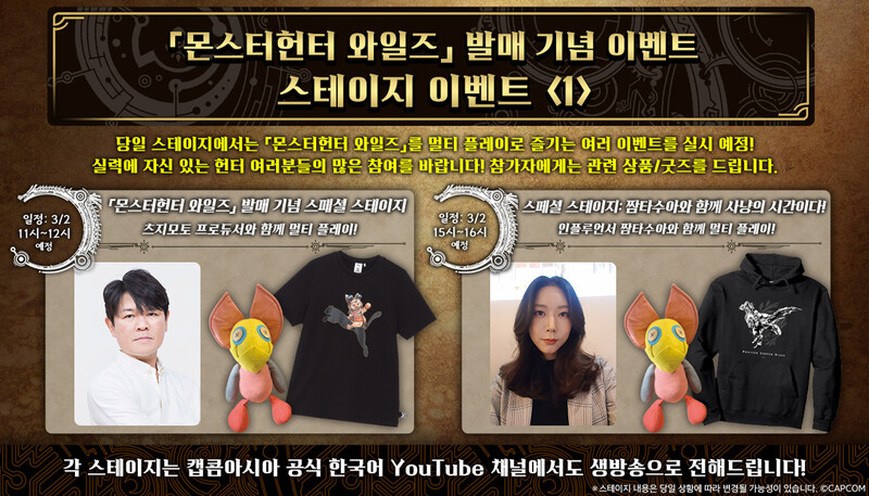 마지막 스테이지 이벤트에서는 몬스터헌터 시리즈 총괄 프로듀서 ‘츠지모토 료조’와 인플루언서 ‘짬타수아’를 만난다. 2일 오전 11시부터 예정된 스페셜 스테이지에서는 츠지모토 프로듀서와 함께 멀티 플레이를 즐기는 챌린지 퀘스트 기획을 진행한다.