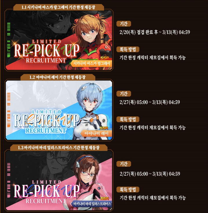 1차 콜라보 캐릭터로 출시한 3종은 '아스카'가 20일, '레이'와 '마리'가 27일부터 재모집이 열린다. 단 모집 기간 종료는 3종 모두 13일 오전 5시까지다.