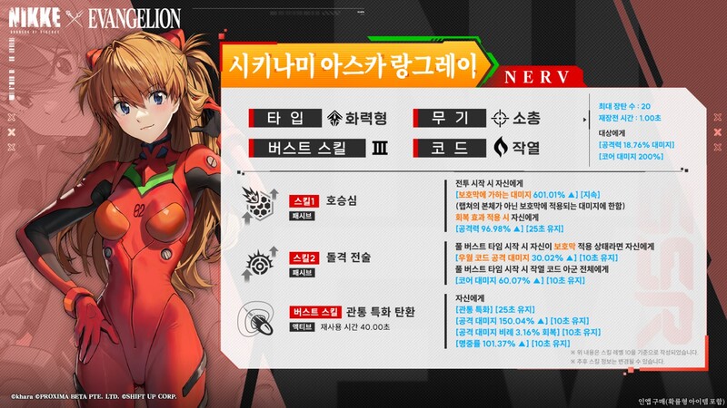 신규 콜라보 SSR 2종은 '시키나미 아스카 랑그레이: WILLE', '아야나미 레이(가칭)'이다. 각각 20일, 27일부터 픽업 시작이다. 둘 모두 풍압 코드 화력형이며, 특히 레이는 머신건 강화 효과가 있어 함께 사용하기 적절해 보인다.
