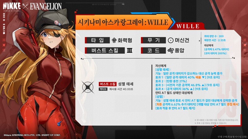 반면 아스카와 주고받는 효과의 위력은 상당하다. 안티 AT 필드 중첩량을 10개 올려주고, 섬멸 태세 추가효과 적용 대상과 공격 범위 및 공격력을 늘려준다. 무엇보다 풀 버스트 직전 버스트 스킬을 사용한 머신건 아군 전체의 예열 속도를 올려 아스카의 패널티를 완전히 지워준다. 서로가 서로에게 반드시 필요한 관계다.