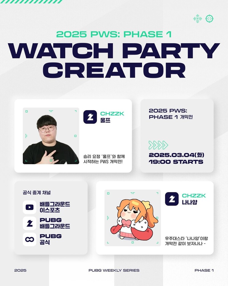 한편, 배틀그라운드 e스포츠 리그인 2025 펍지 위클리 시리즈는 3월 4일부터 한 달간 매주 화, 목, 토요일에 진행하며 두 번에 페이즈를 거쳐 상위권 팀을 선발, 국제전인 펍지 글로벌 시리즈에 진출할 수 있다. 또한, 크래프톤은 첫번째 페이즈의 마지막 경기인 결선에서도 워치파티를 진행 예정이라고 밝혔다.