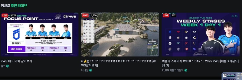 크래프톤의 'PUBG: 배틀그라운드' e스포츠 한국 지역대회인 2025 펍지 위클리 시리즈(PWS)가 3월 4일 개막했다. 중계 및 해설은 유튜브, SOOP, 치지직의 배틀그라운드 공식 채널을 통해 제공됐으며 16개 프로팀이 첫 경기를 진행했다.