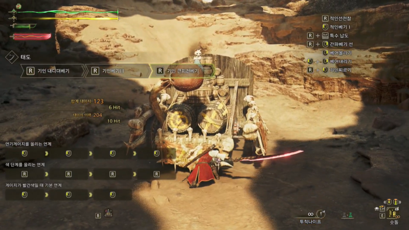 기인 베기 콤보(코팅 단계 상승): 기인 베기l(R2) - 기인 베기ll(R2) - 기인 베기lll(R2) - 기인 큰회전베기(R2)