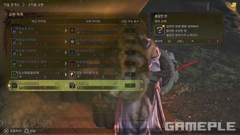 몬스터 사냥으로 해결되는 것이 아니라, 낮은 확률 교환을 운으로 여러 번 뚫어야 하기 때문에 가지려는 마음이 더 커진다. 조사 포인트를 녹이면서 결국 핵심 의상 파츠를 입수하는 데 성공했다. 키워드 재료는 '불길한 천'이다.
