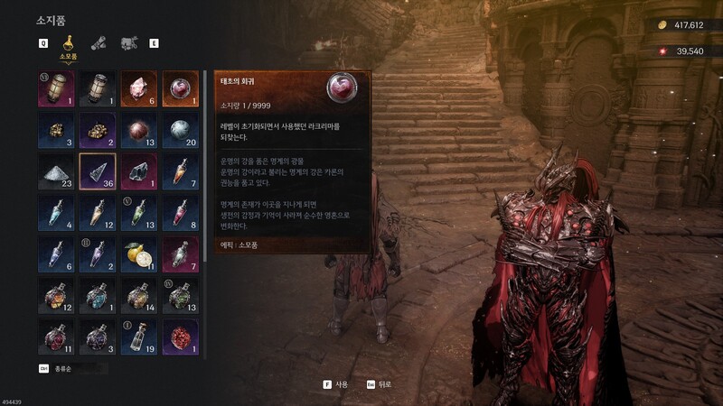 만약 능력치를 잘못 분배했거나 무기를 바꾸고 싶어 능력치 재분배를 원한다면, 레벨을 초기화하면 된다. ‘태초의 회귀’ 아이템을 사용해서 레벨을 초기화할 수 있으며, 레벨을 초기화하면 사용했던 라크리마를 되찾을 수 있다. ‘태초의 회귀’는 스코파 동굴에 있는 NPC ‘음유시인’에게 쉽게 구매할 수 있다.