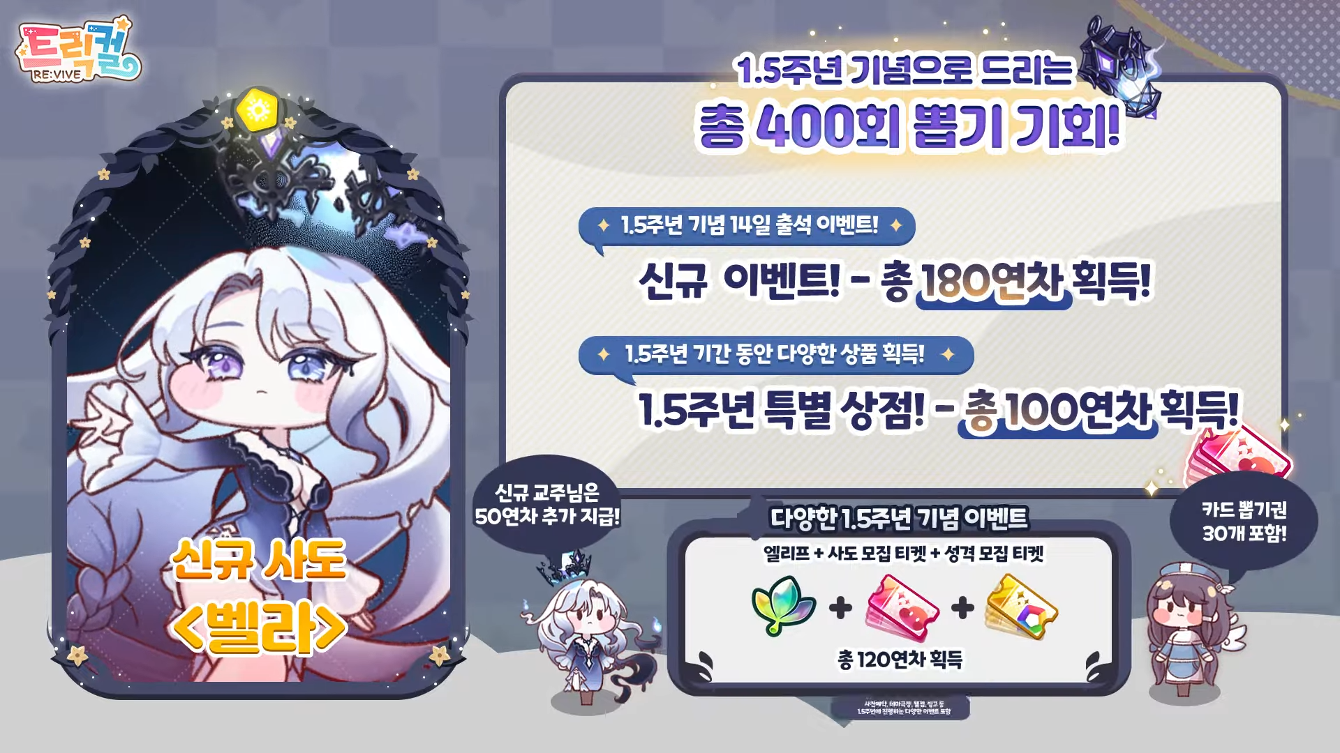 에피드게임즈의 '트릭컬: 리바이브'가 27일 1.5주년 이벤트에 돌입한다. 이번 이벤트를 통해 제법 많은 재화를 제공하기 때문에 입문하기 좋다. 실제로 제법 많은 유저가 1주년부터 관심을 가진 뒤 신입 교주로 게임을 시작하고 있다.
