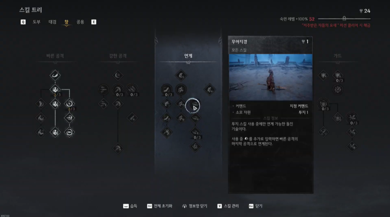 마지막 스킬트리인 ‘무아지경: 해방’까지 찍었다면 투지 스킬이 아니더라도 모든 공격 스킬에 무아지경을 연계할 수 있다. 다만, 투지를 소모하기 때문에 자주 발동할 수 있는 스킬은 아니다.