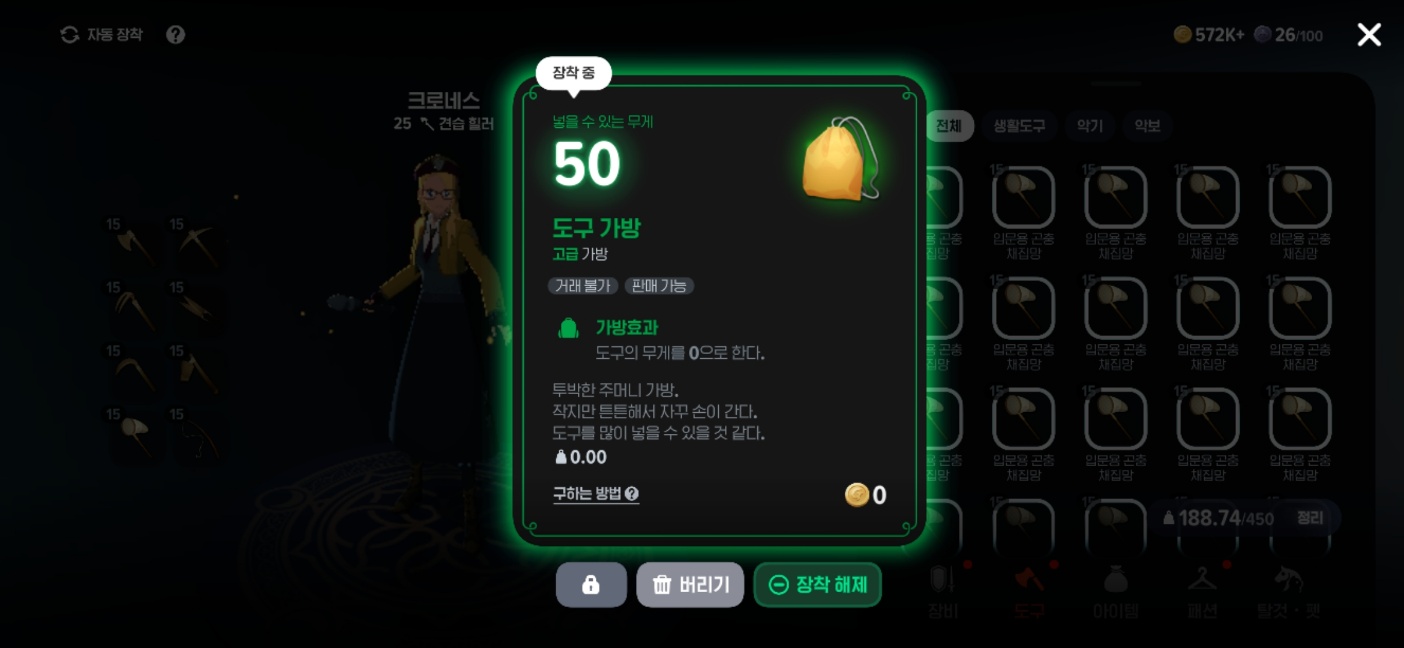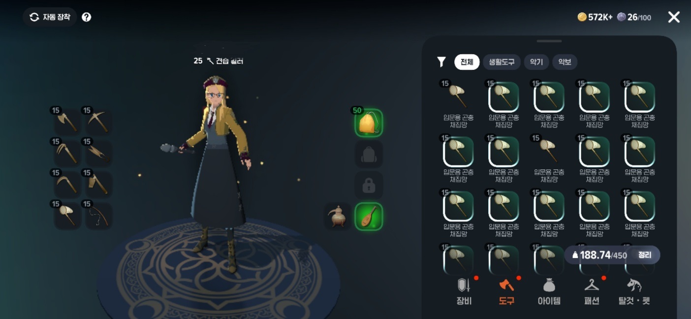 장시간 채집으로 인한 도구 내구도 소모는 아이템을 여러 개 장만하는 방법으로 해결할 수 있다. 자동 채집 중 도구 내구도가 떨어지면 자동으로 바꿔 장착한다. 이를 위해 도구 가방이 필요한 것이다.