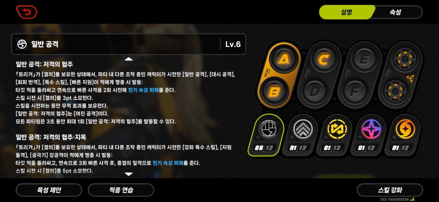다만 여진 공격을 하려면 '결의' 스택을 쌓아야 한다. 이는 약간의 공격과 강화 스킬, 궁극기를 통해 해결할 수 있다. 패링 직후 조금만 공격해 주고 강화 스킬 게이지나 데시벨이 채워지는 대로 바로 사용하면 된다.