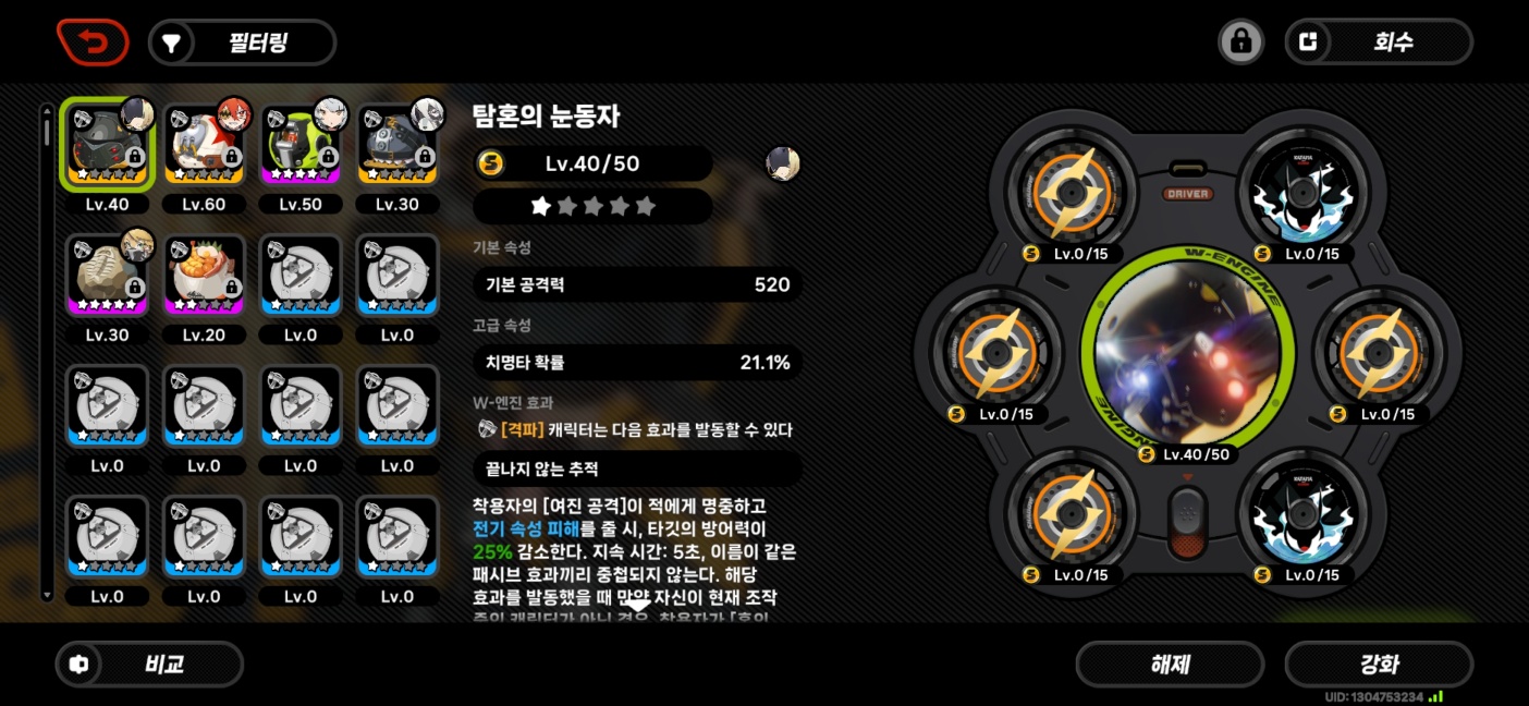 W-엔진은 전용 엔진인 '탐혼의 눈동자'가 압도적이다. 탐혼의 눈동자는 트리거의 모든 특성을 완벽하게 돕는다. 여진 공격이 발동했을 때 적의 방어력을 깎고 공격력을 올려준다.