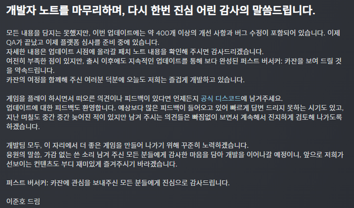 후반부 레벨 디자인에 대해서는 “난이도가 지나치게 높다는 유저 피드백에 깊이 공감한다”며 “가능한 빠르게 개선할 수 있는 부분들을 반영해 높은 난이도와 불편 요소, 피로도를 개선했다”고 전했다.