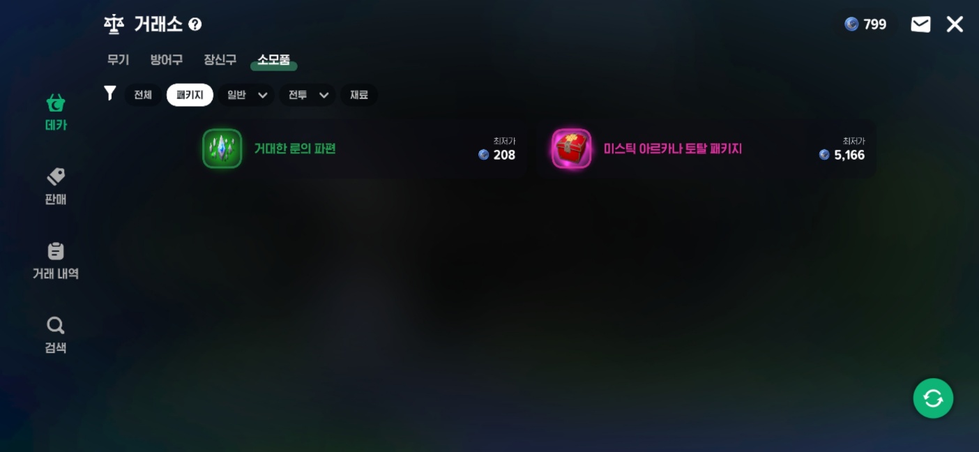 레벨을 30까지 올리면 그때부터 거래소를 활용할 수 있게 된다. 거래소에서는 다양한 아이템을 데카로 거래할 수 있다. 이중 눈에 띄는 것은 과금을 통해 구매할 수 있는 미스틱 아르카나다. 무과금이나 소과금 유저라면 이를 노리고 데카를 부지런히 버는 것이 좋다.