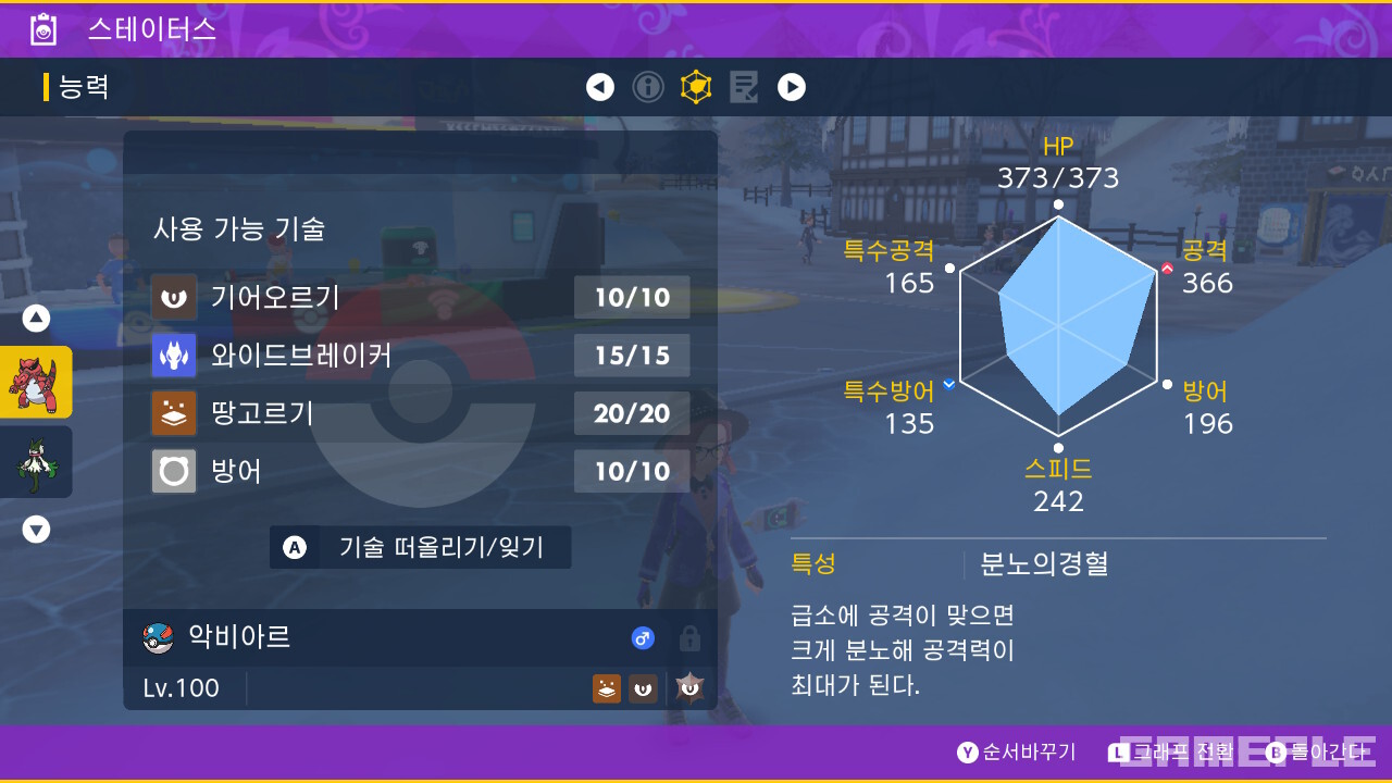 이번 레이드 추천 포켓몬은 악비아르다. 일단 DLC 등을 활용하지 않아도 입수가 쉬운 점이 가장 매력적이다.