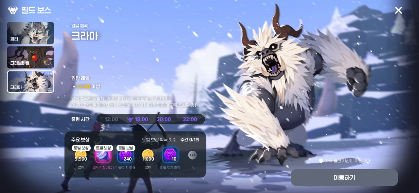 필드 보스 사냥은 꼭 하는 것이 좋다. 주요 토벌 보상은 주 1회만 주기 때문에 현재는 세 번만 하면 끝이다. 이후 이어서 계속 도전할 수 있지만, 효율이 나빠 추천하지는 않는다.
