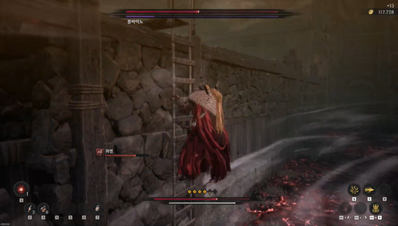 볼바이노가 왼손에 잡은 못이 빨갛게 달궈지면 가드로 왼손 공격을 막더라도 화염 디버프가 쌓인다. 이때는 가드보다는 회피를 사용하는 것이 좋다.
