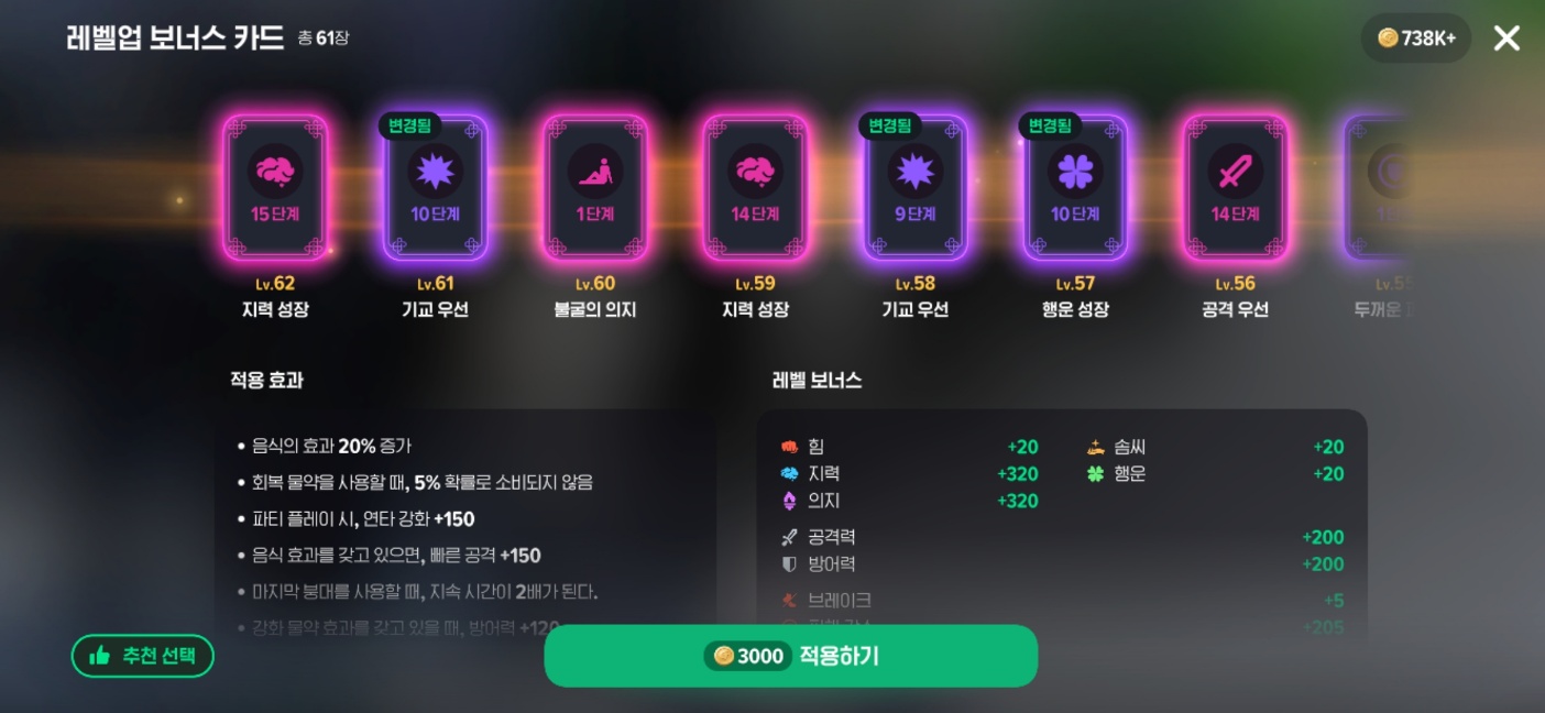 전직을 할 때 중요하지만 잊기 쉬운 것이 있다. 레벨업 보너스 카드다. 레벨업을 할때 추가로 얻는 보너스 카드는 당시 클래스를 기준으로 추천이 들어온다. 그래서 보통 추천 카드를 그대로 고른다.