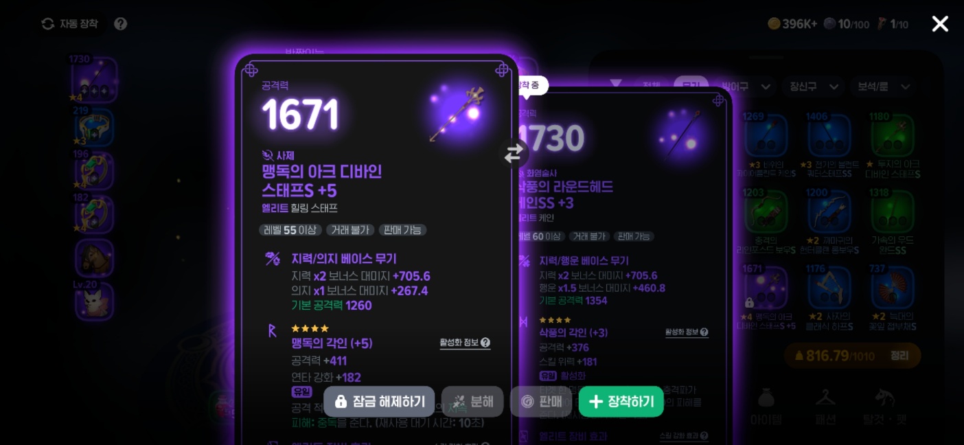 전직을 하고 나면 생기는 또 다른 고민거리는 장비다. 레벨이 올라갈수록 클래스에 최적화된 장비를 장착하게 된다. 던전 등에서 입수하는 아이템도 현재 클래스 기준으로 주어진다. 방어구는 슬롯 수나 룬이 더 중요하기에 조금 나중에 신경 써도 된다. 다만, 무기는 그렇지 않다.