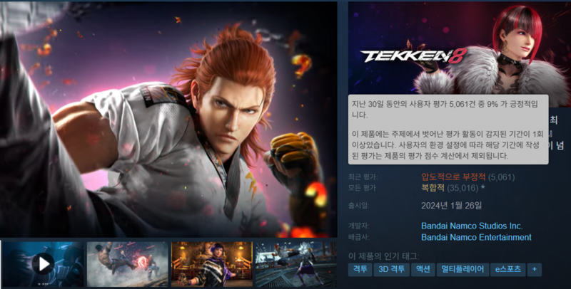 반다이남코의 '철권8' 시즌2가 기록하는 역대급 평가에 모든 게이머들이 놀라고 있다. 스팀 최근 평가 '압도적으로 부정적', 긍정률은 9%까지 떨어졌다.