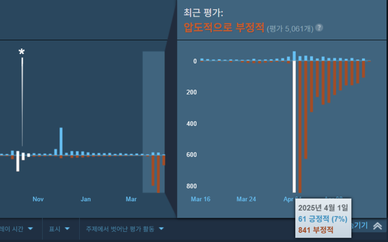 그러나 업데이트 후 평가는 역으로 곤두박질쳤다. 업데이트 첫날, 93%에 달하는 유저가 '부정적' 리뷰에 표를 던졌다. 전체 평가는 '복합적'으로 다시 떨어졌다. 매일 혹평이 줄을 이은 결과, 스팀 최근 30일 평가는 한 자릿수까지 떨어지는 귀한 풍경이 연출됐다.