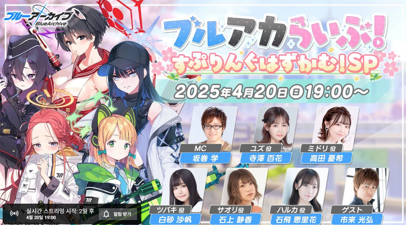넥슨게임즈의 '블루 아카이브'도 요스타가 서비스하는 일본 지역에서 주말 발표를 가진다. 일요일(20일) 오후 7시부터 '블루아카 라이브! 스프링 해즈 컴!' 방송을 개최하고 성우 패널들과 함께 게임 안팎 정보를 공개한다. 평균 3시간 가량 진행되는 대규모 방송이다.