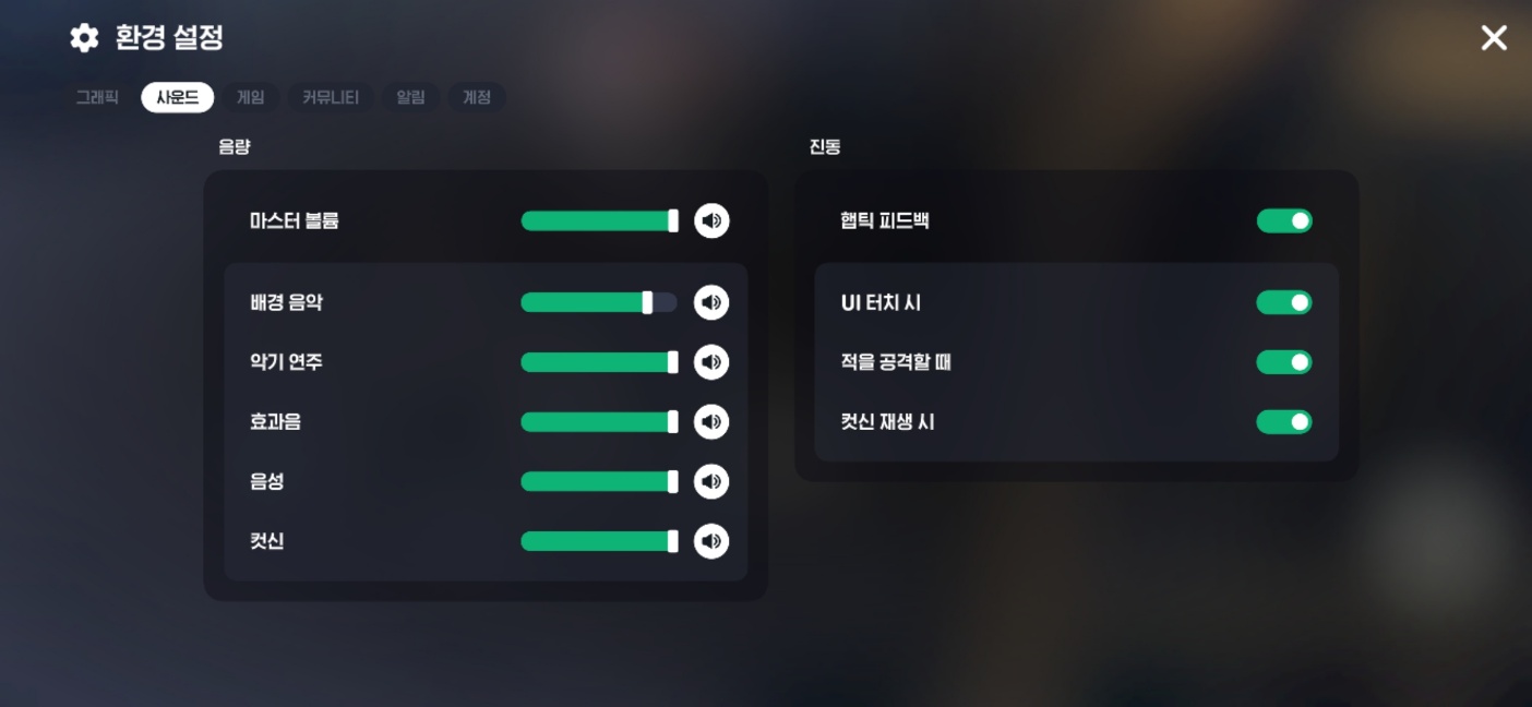 사운드 부분에서 의외로 중요한 것이 있다. 햅틱 피드백이다. 있으면 연금이나 전투할 때 핸드폰이 움직이는 것이 재미있지만, 이 기능은 배터리를 많이 소모한다. 마비노기 모바일을 하면서 배터리가 빨리 소모된다는 느낌이 든다면 이것 때문일 확률이 있으다. 햅틱의 손맛을 좋아한다면 키는 것도 나쁘지 않다.
